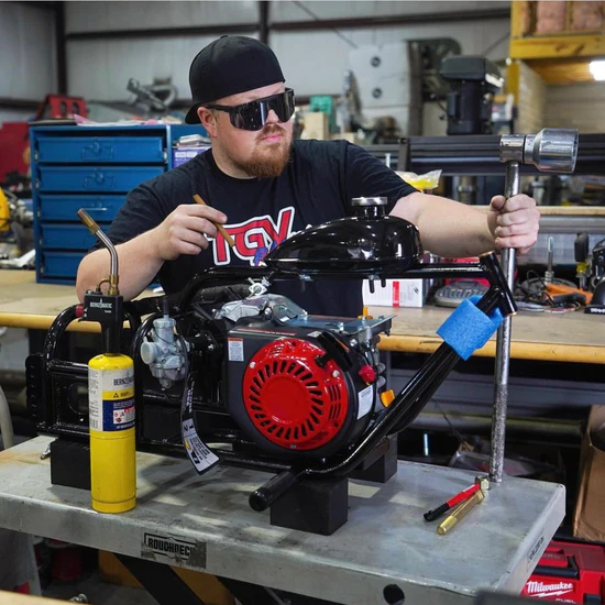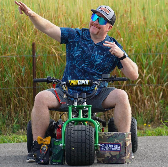 Stretch is our lead welder and assembler of mini trikes! He enjoys wrenching on his OBS Ford F350 Dually and drinking Lattes. He’s also the tallest guy in the shop, hence why we call him “Stretch”