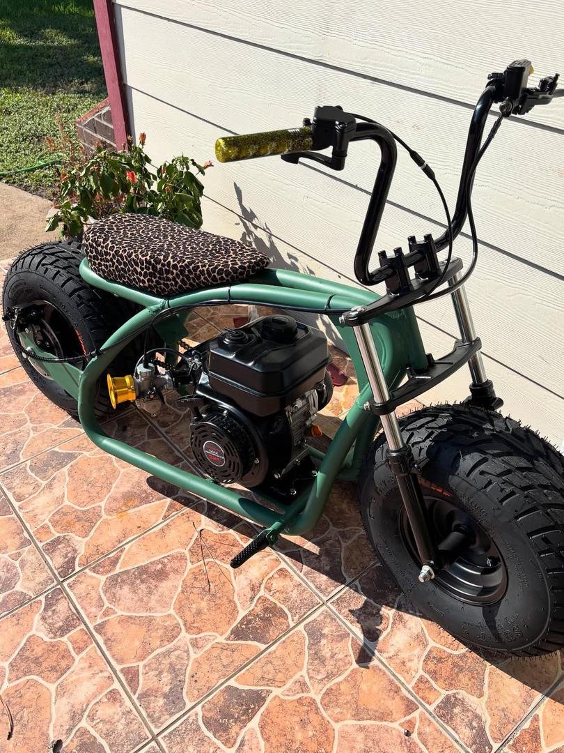 This is the minibike built for serious adventure. It starts with rugged heavy-duty steel-tube construction, adds in a powerful 212cc engine, and completes the package with large low-pressure tires and a front hydraulic suspension for a confident, capable ride over any terrain.