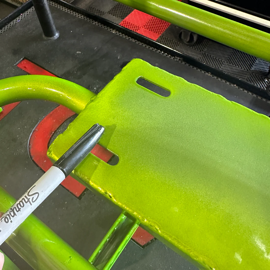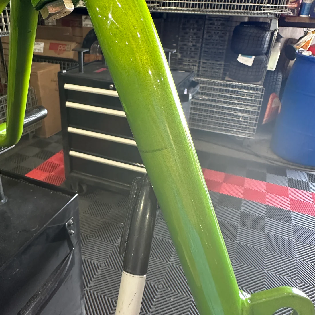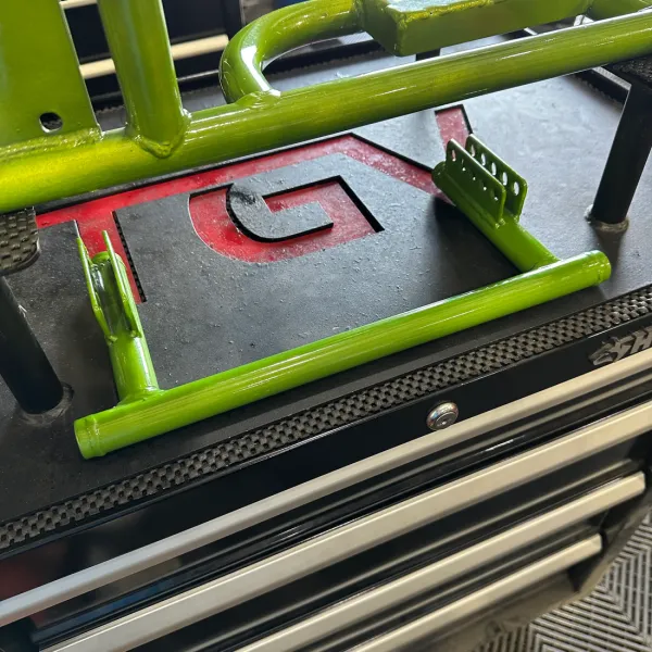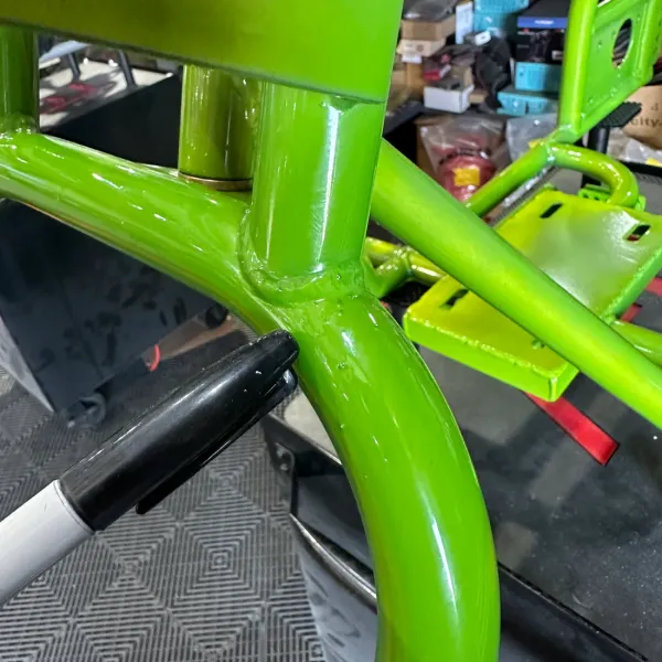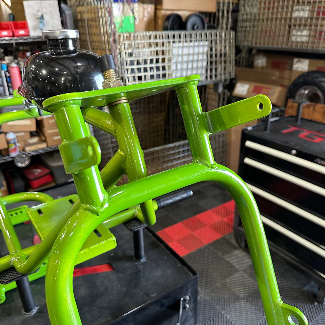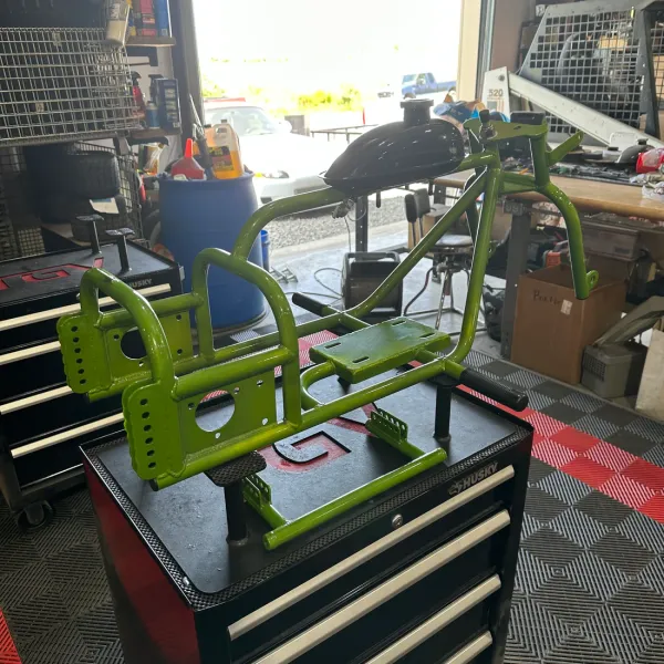 This is a complete welded together gen 1 TGV trike frame. An unnamed old employee personally f*cked this frame up. There are inconsistencies in the powder coat throughout the entire frame, weld bb’s, and chips. (Please see photos for details). The frame is completely functional but not up to our high standards to sell at full price. The frame will include what is shown on it (including tank) and wheelie bars. We are offering local pickup or shipping but just know that we don’t usually ship powder coated parts due to the chance of them being scratched or chipped while enroute but this one is already f*cked up! If you’re looking for a budget option to build your mini trike this is it.